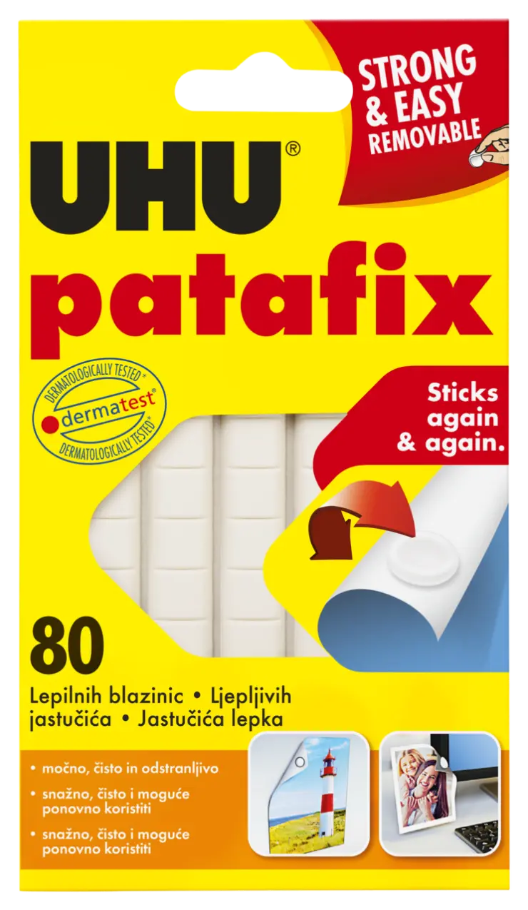 PATAFIX ORIGINAL, UHU Patafix white patafix – pametna zamjena za čavle, ljepljivu traku i pribadače! PATAFIX ORIGINAL, UHU Patafix white patafix može se ukloniti i ponovno koristiti za brzo i čisto pričvršćivanje sitnih predmeta kao što su fotografije, razglednice, crteži, posteri itd. ...na razne površine kao što su zidovi, vrata ili namještaj. Na tisuće načina za uporabu kod kuće, u školi ili u uredu! Dermatološki testirano.* *PATAFIX ORIGINAL, UHU Patafix white patafix ostvario je rezultat „VRLO DOBRO” na dermatološkim testovima koje je proveo nezavisni institut dermatest®.