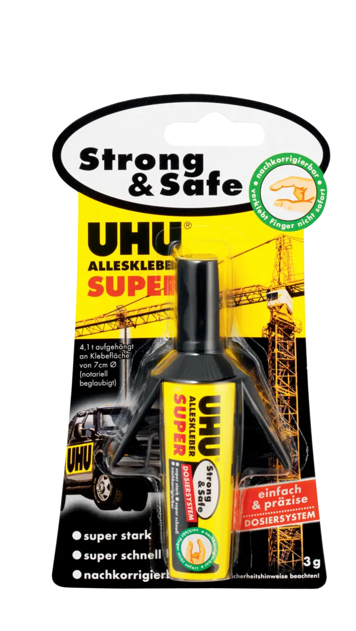 AP SUPER, UHU All Purpose Super Strong & Safe univerzalno ljepilo SUPER Strong & Safe, iznimno snažno i iznimno brzo ljepilo u preciznom sustavu za doziranje – bez trenutnog lijepljenja prstiju. Patentirana formula može se korigirati približno 20 sekundi i prikladna je za gotovo sve rastezljive, čvrste, porozne i neporozne materijale. Podnosi vibracije i udarce, fleksibilno je, prozirno i bez mirisa. Otporno na vlagu i temperaturu od –50 °C do +100 °C. Patentirani sustav za doziranje omogućuje jednostavno i precizno nanošenje željene količine ljepila, a ambalaža je stabilna i otporna na udarce. Savršeno rješenje za sve vrste manjih građevinskih projekata i popravaka.