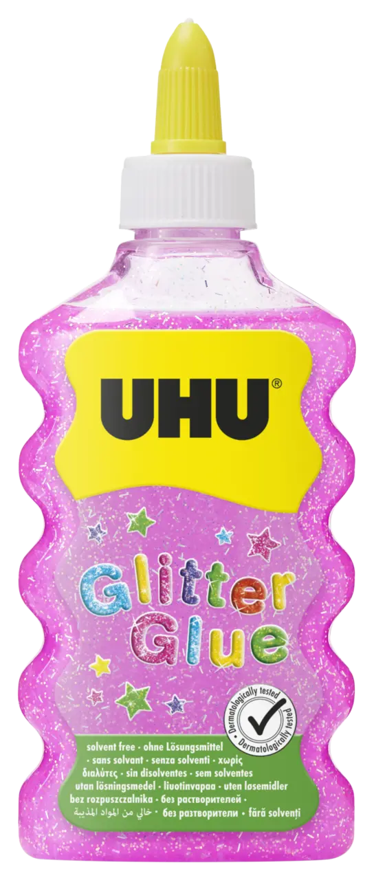 UHU ljepilo Glitter – ljepilo u boji sa šljokicama za izradu rukotvorina i kreativno ukrašavanje raznih materijala. Svijetle boje i sjajni svjetlucavi efekti. Mekana bočica s preciznim aplikatorom omogućuje čist i precizan rad. Ne kaplje i ne rasteže se. UHU ljepilo Glitter ne sadrži otapala i ispire se vodom te je dermatološki testirano. Dostupno u 6 svijetlih boja.