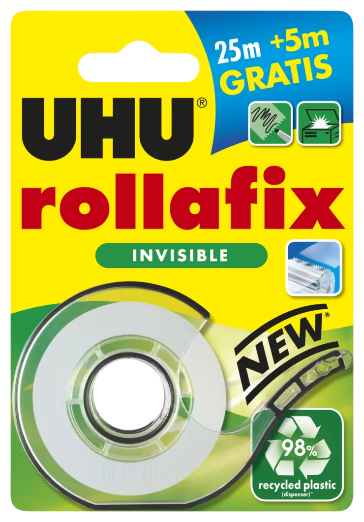 Nevidljiva traka vrhunske kvalitete. Može se pisati po njoj i neutralna je na kopijama. Lako se trga rukom. Također dostupna u praktičnim dozatorima s metalnom oštricom za uredno rezanje. Za mnoge namjene kod kuće, u školi i u uredu.