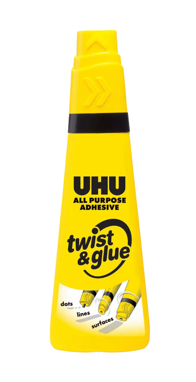 AP TWIST & GLUE, UHU All Purpose Adhesive twist & glue twist & glue, dokazano tekuće univerzalno ljepilo u mekanoj i praktičnoj plastičnoj bočici s jedinstvenim aplikatorom koji se može namjestiti u 3 položaja za lijepljenje točaka, linija i površina. Idealno je za širok raspon primjena kod kuće, u školi i uredu, za rukotvorine i modelarstvo. Potpuno prozirna formula brzo se suši i ispire se na 60 °C. Može se ponovno puniti. Omogućuje jednostavno i precizno lijepljenje po mjeri.