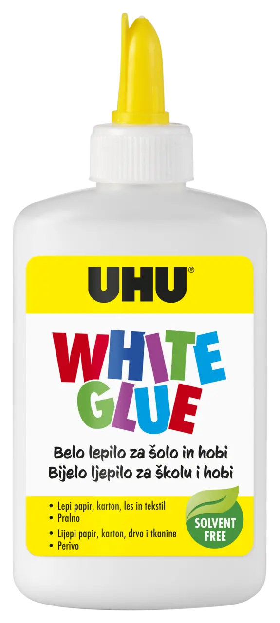 WHITE-/CRAFTS GLUE, UHU White Glue - International White Glue – Ljepilo za rukotvorine bez otapala za kreativnu zabavu. Prikladno za sve uobičajene materijale za rukotvorine te postaje prozirno kada se osuši. U praktičnoj bočici za jednostavno i čisto lijepljenje. S ugrađenom aplikatorom za ravnomjerno nanošenje ljepila. Ljepilo se ispire na 30°C.