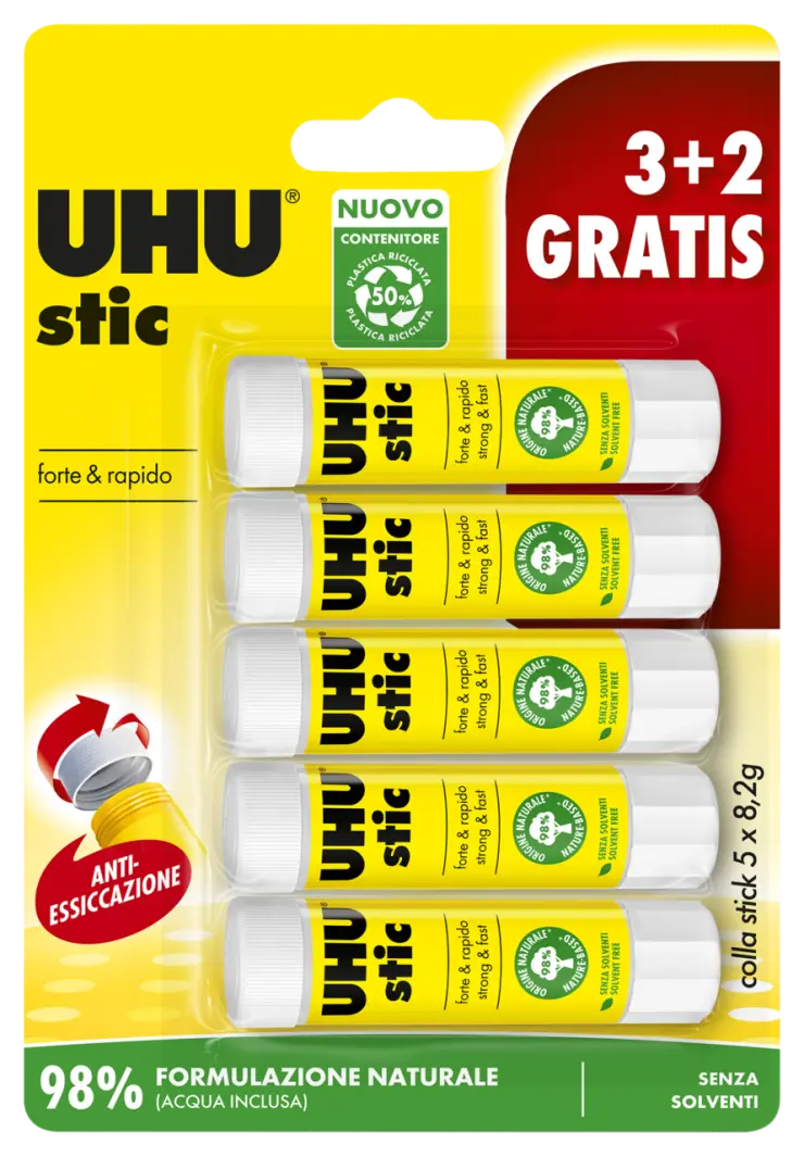 UHU la colla va applicata con una leggera pressione sul materiale da incollare. Le due superfici vanno unite immediatamente dopo aver applicato la colla.
