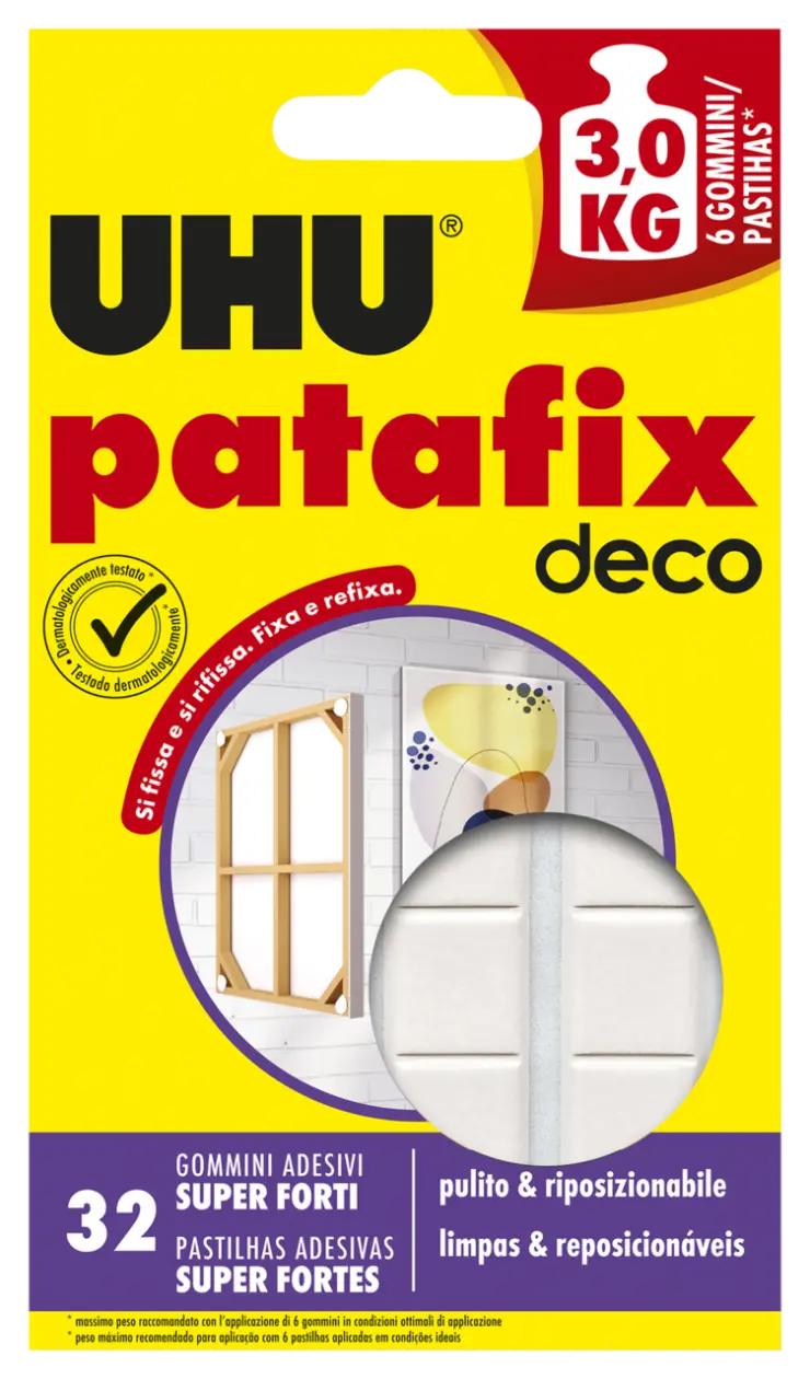 Eventuali residui possono essere rimossi tamponando con un altro gomminao adesivo. UHU patafix può lasciare tracce untuose sulle superfici assorbenti, tali tracce possono in genere essere rimosse con benzina.