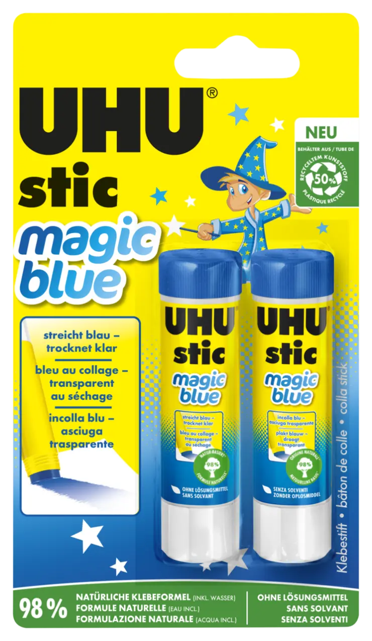UHU stic Magic si applica con una leggera pressione sul materiale che deve essere incollato. Le parti sono immediatamente incollate dopo l'applicazione della colla. Il blu sparisce in pochi secondi dopo l'applicazione e diventa trasparente non appena la colla è asciutta.