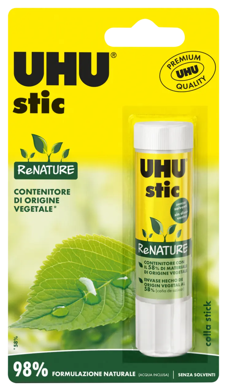 Colla stick "Made in Germany" in tubetto composto per il 58% da materie prime di origine vegetale. Riduce le emissioni di CO2* ed il consumo di materie prime fossili*. Dotata di un esclusivo tappo a vite che impedisce l’essiccazione della colla. La formula della colla è costituita per il 98% da ingredienti naturali (inclusa l’acqua) ed è priva di solventi. Incolla in modo resistente, rapido e durevole, è facile da applicare, altamente efficiente e, naturalmente, lavabile a freddo. *rispetto agli stick GLUE STICKS RENATURE, UHU stic Pasta white Relaunch, GREEN BRAND standard, con una media calcolata sul ciclo totale di vita della colla (calcolo effettuato da denkstatt / Vienna, aprile 2013)