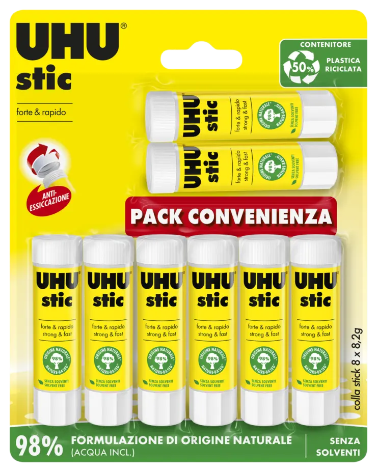 - Formula della colla priva di solventi e costituita per il 98% da ingredienti naturali (inclusa l’acqua)