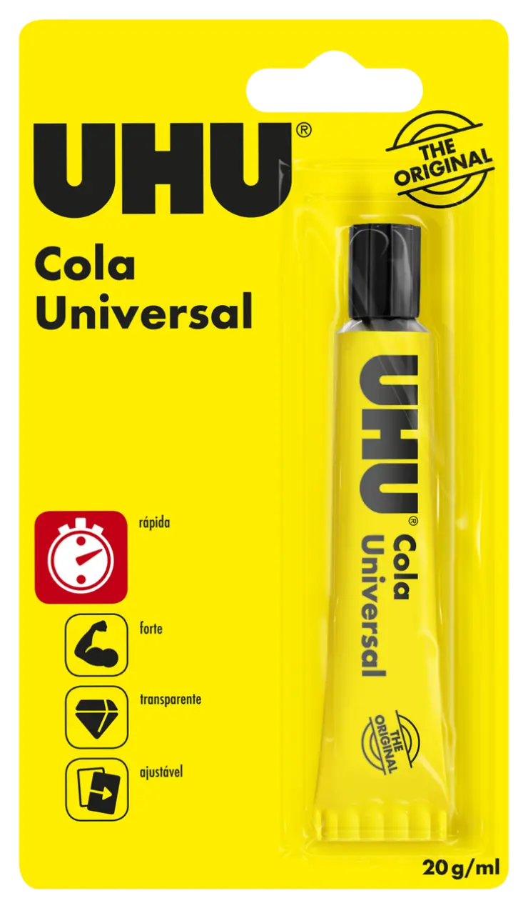 UHU Cola Universal, a cola de resina sintética líquida comprovada para colagens rápidas e transparentes. Adequada para aplicações universais em casa, no escritório, para modelismo, na escola, para artesanato, etc. Cola diversos materiais rapidamente e com durabilidade. Uma vez aplicada, a cola mantém-se temporariamente ajustável e não enruga o papel.