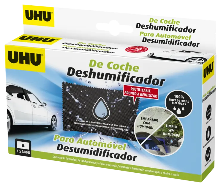 USAR: Remova o saco de plástico antes do primeiro uso. Coloque o Desumidificador Auto dentro do carro, de preferência próximo do pára-brisas. Quando o indicador de humidade (na forma de uma gota de água) mudar de cor de azul para rosa, significa que está completamente cheio e é necessário recarregar para uma nova utilização. RECARREGAR: Coloque o Desumidificador Auto numa tigela ou prato adequado para ir ao micro-ondas, com o indicador de humidade voltado para cima. Deixe no micro-ondas por 6 minutos a 600 watts. PRONTO PARA REUTILIZAR: Depois de recarregar no micro-ondas, a humidade dentro do desumidificador evapora e o indicador de humidade fica azul novamente. Está pronto para ser reutilizado!