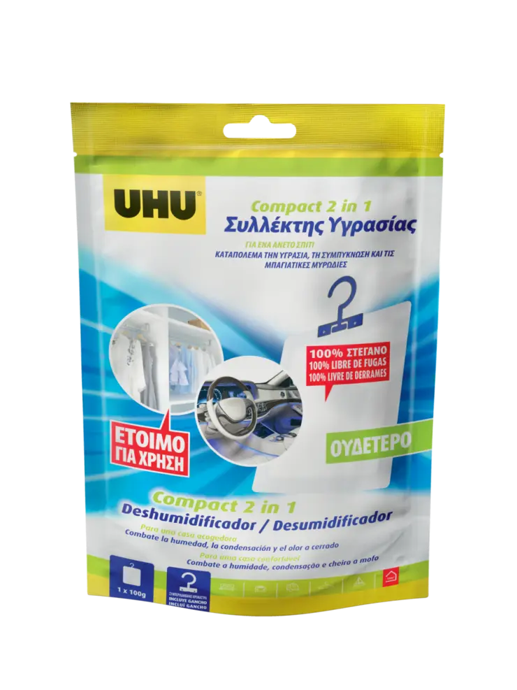 Abra a embalagem e remova o Desumidificador Compact. Fixe o suspensório, se necessário, nos orifícios destinados a esse fim. Coloque com o lado impresso voltado para baixo ou contra a parede no (pequeno) espaço onde o problema de humidade é encontrado. Quando o Desumidificador Compact estiver completamente preenchido com gel significa que está saturado e poderá então ser descartado como lixo doméstico.