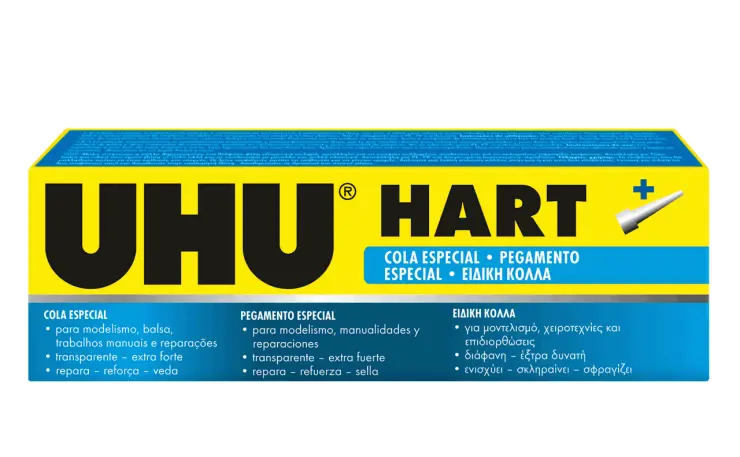 UHU HART é uma cola especial transparente, de secagem rápida para montagem de pequenas peças em modelismo, para artesanato e para uso doméstico geral. Especialmente adequada para madeira de balsa e derivados da madeira. UHU HART forma uma película dura. É por isso também adequada para fortalecer e reforçar áreas fracas e para endurecer superfícies de muitos tipos de materiais.