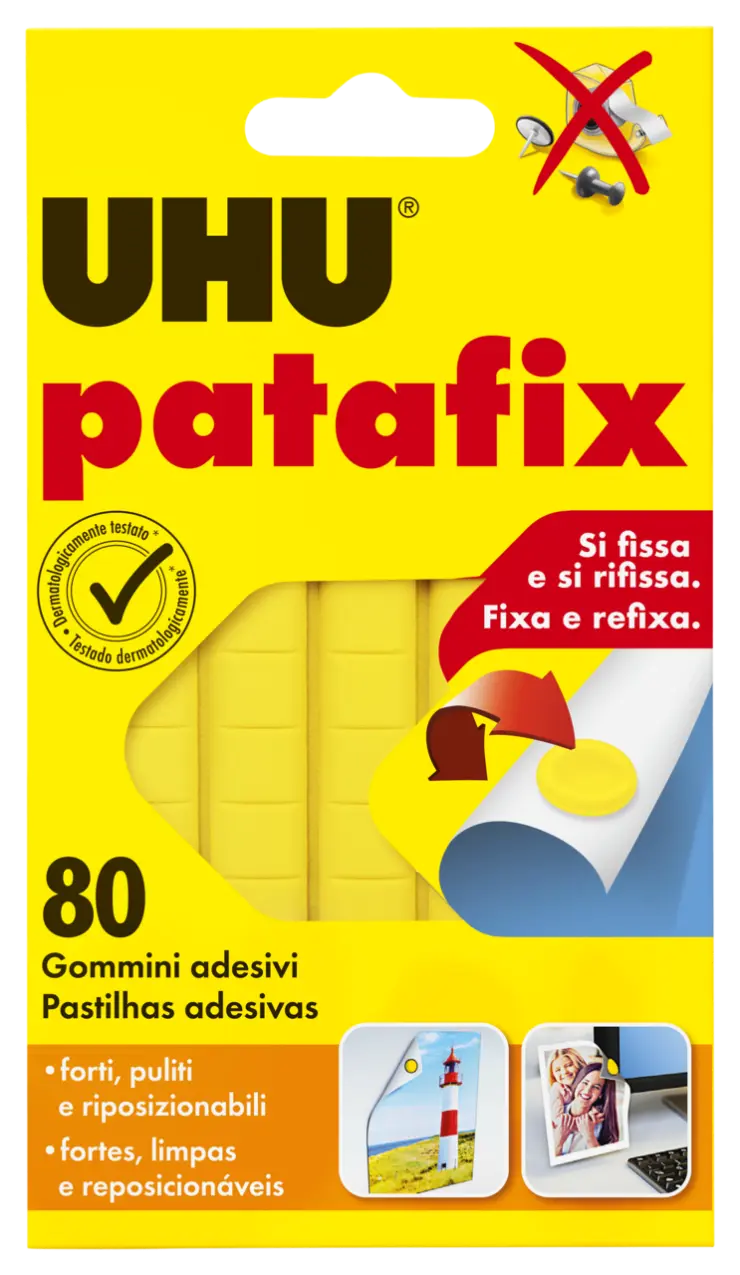Eventuais resíduos podem ser removidos agarrando-os com outra pastilha de cola. A UHU patafix pode deixar uma marca gordurosa em algumas superfícies absorventes que pode ser removida com benzina.