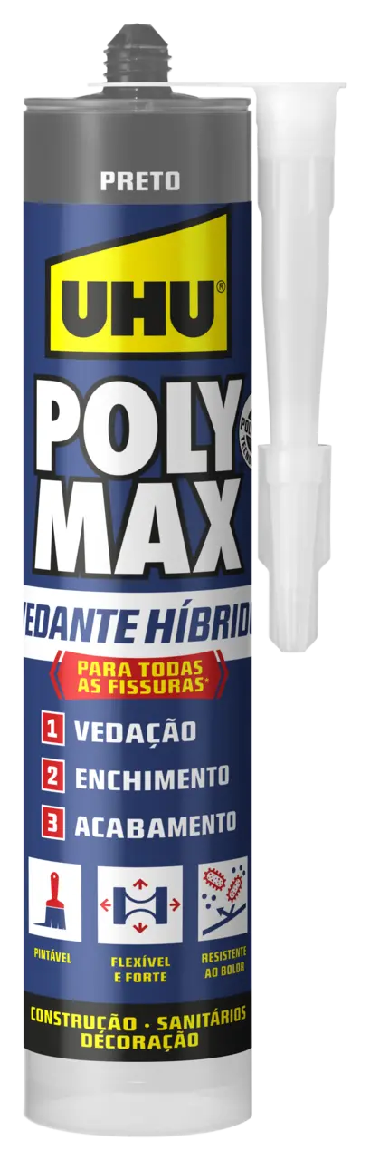 · O selante pode ser utilizado com água após 2 horas, no entanto, não tocar ou utilizar imediatamente. · Recomendamos nas aplicações de colagem, ®UHU Poly Max® High Tack Express · Pode ser pintado com todas as tintas acrílicas. Dica: Dada a grande variedade de tintas, recomendamos que verifique sempre com antecedência a compatibilidade da tinta com o selante. Para obter os melhores resultados, recomenda-se que pinte alguns dias após a aplicação. · Tenha em conta que o tempo de cura das tintas alquídicas pode demorar mais tempo. · A ausência total de UV pode causar a descoloração do selante. A possível descoloração não afeta as propriedades técnicas do selante. · Devido à variedade de substratos (por exemplo, metais, plásticos, etc.), recomenda-se a realização de um teste de compatibilidade e adesão do material em caso de dúvida. · Não é adequado para juntas com água parada permanente.