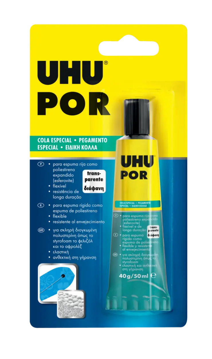 UHU POR é uma cola especial de secagem rápida para colar poliestireno expandido, por ex. Styropor® (esferovite) também em combinação com outros materiais. Forma uma película de cola elástica que é altamente resistente ao envelhecimento e é incolor e à prova de água.
