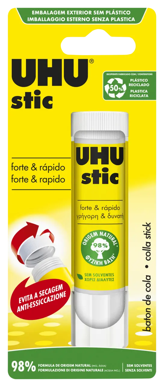 O conhecido bastão de cola "Produzida na Alemanha" com uma tampa de rosca única que evita que a cola seque. A fórmula da cola consiste em 98% de ingredientes naturais (incluindo água) e isento de solventes. As colas fortes, rápidas e duráveis, deslizam suavemente, são altamente eficientes e, claro, são laváveis a frio.