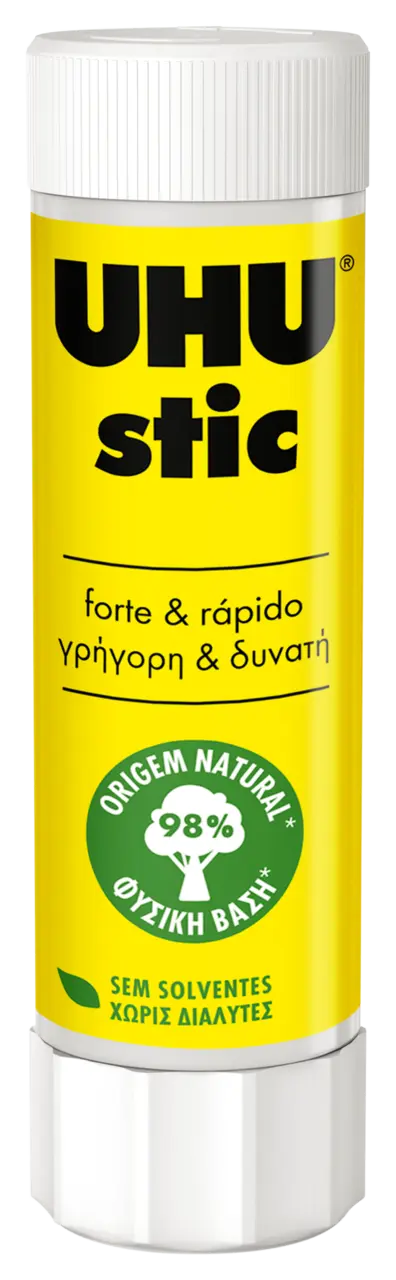 O conhecido bastão de cola "Produzida na Alemanha" com uma tampa de rosca única que evita que a cola seque. A fórmula da cola consiste em 98% de ingredientes naturais (incluindo água) e isento de solventes. As colas fortes, rápidas e duráveis, deslizam suavemente, são altamente eficientes e, claro, são laváveis a frio.