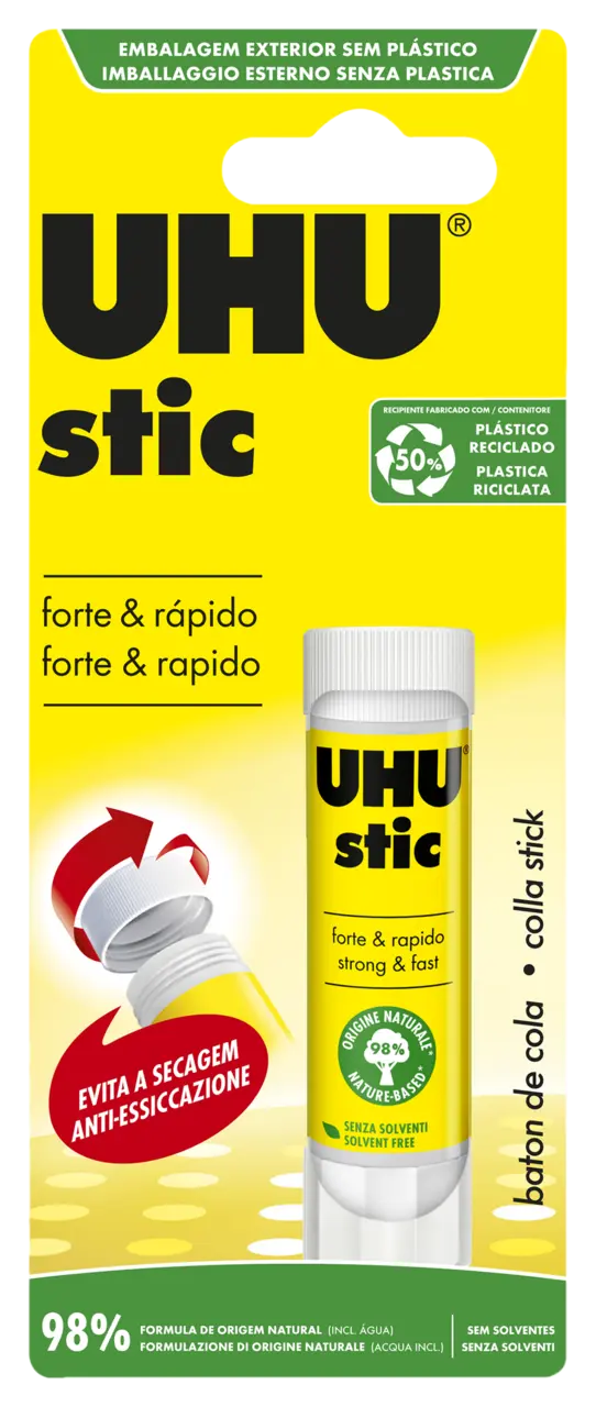 O conhecido bastão de cola "Produzida na Alemanha" com uma tampa de rosca única que evita que a cola seque. A fórmula da cola consiste em 98% de ingredientes naturais (incluindo água) e isento de solventes. As colas fortes, rápidas e duráveis, deslizam suavemente, são altamente eficientes e, claro, são laváveis a frio.