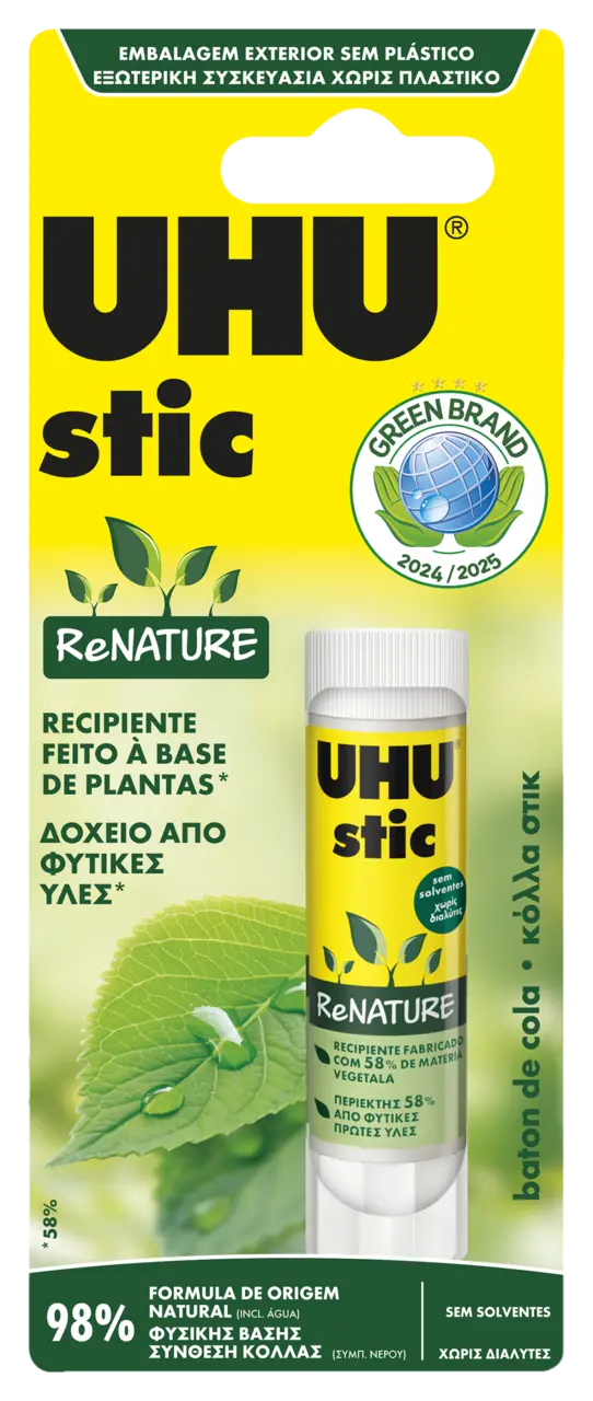 - Lavável a frio * em comparação com o padrão GLUE STICKS RENATURE, UHU stic Pasta white Relaunch, GREEN BRAND stic em média acima do ciclo de vida total (calculado por denkstatt / Viena, abril de 2013)