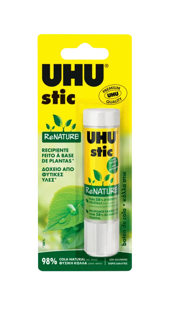 A UHU stic ReNATURE é aplicada com uma ligeira pressão sobre os materiais a colar. As peças devem ser montadas imediatamente após a aplicação da cola.