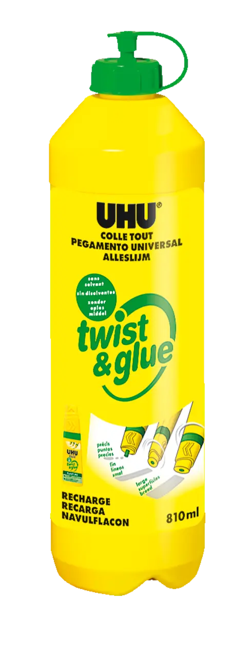 Limpe cuidadosamente as superfícies a serem coladas (seque e sem poeira e graxa). Aplique o adesivo em uma camada fina e pressione para fixar. Para recarregar os frascos de UHU Twist & Glue: 1) Gire o anel verde no sentido horário para desparafusar o aplicador completo. 2) Encha novamente o frasco de torção e parafuse novamente o aplicador no sentido anti-horário no frasco.