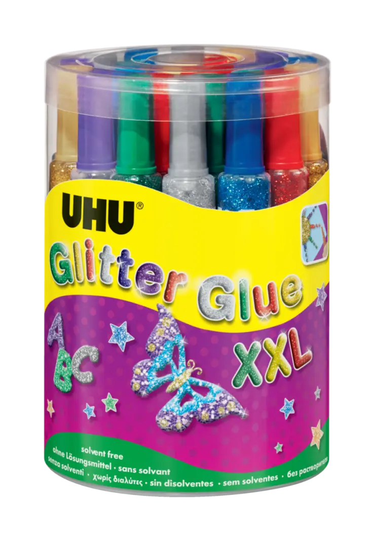 Desenrosque a tampa colorida. Comprima o tubo suavemente para aplicar a cola. Volte a colocar a tampa depois de usar. Dependendo da quantidade aplicada, a UHU Glitter Glue fica seca ao toque após cerca de 30 minutos e completamente seca em aprox. 12 horas. O contacto com a água dissolve a UHU Glitter Glue, isso significa que não suporta as operações de lavagem. Dica de utilização: A primeira vez que usar a UHU Glitter Glue, experimente primeiro num bocado de papel para ficar a saber como deve usar o novo aplicador de precisão.