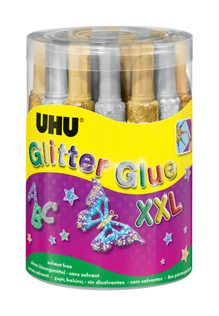 Desenrosque a tampa colorida. Comprima o tubo suavemente para aplicar a cola. Volte a colocar a tampa depois de usar. Dependendo da quantidade aplicada, a UHU Glitter Glue fica seca ao toque após cerca de 30 minutos e completamente seca em aprox. 12 horas. O contacto com a água dissolve a UHU Glitter Glue, isso significa que não suporta as operações de lavagem. Dica de utilização: A primeira vez que usar a UHU Glitter Glue, experimente primeiro num bocado de papel para ficar a saber como deve usar o novo aplicador de precisão.